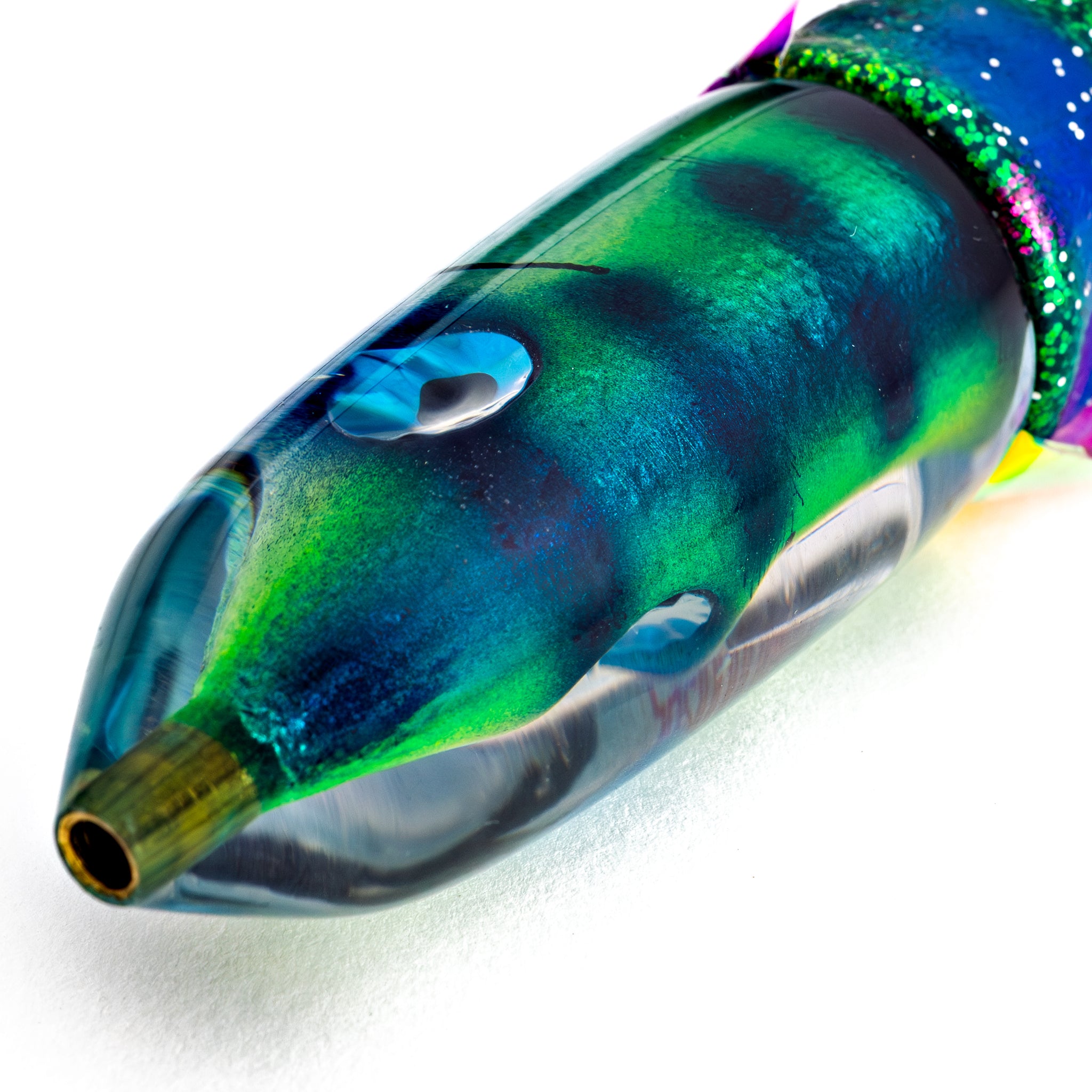 Proven from Hawaii to Australia, the Moke Bullet runs just below the surface then skitters across the top like a fleeing flying fish. Easy to pull from any position, it's deadly on big tuna and attracts all species.